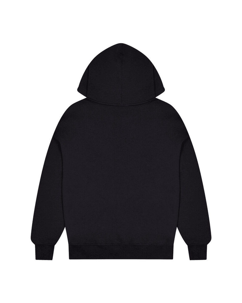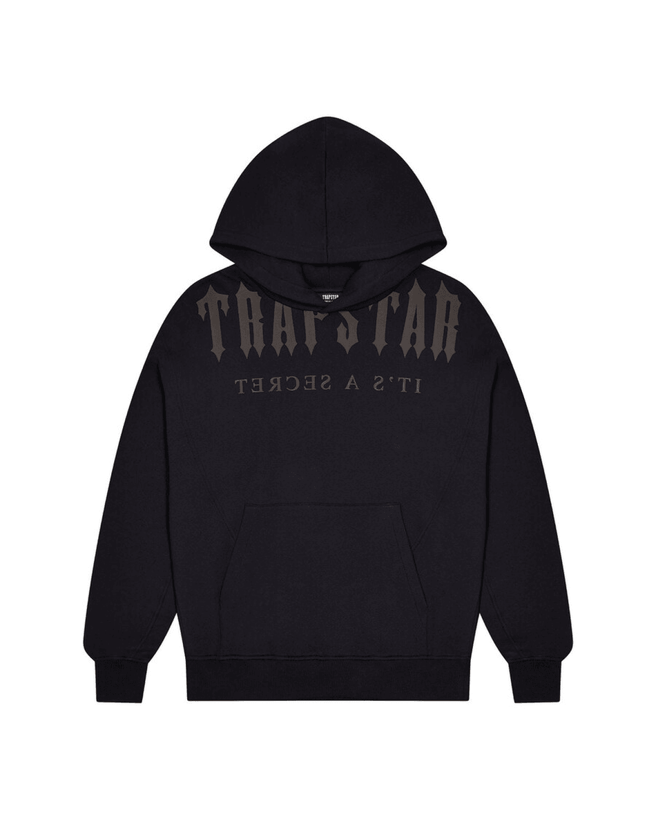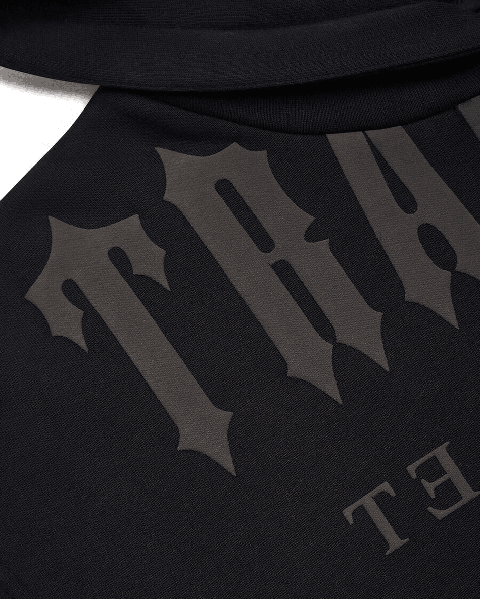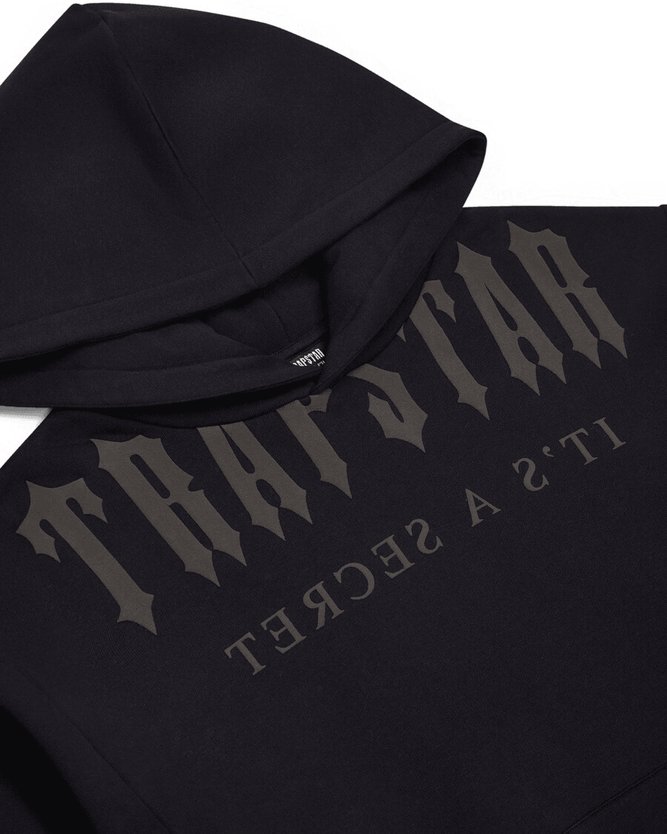 The Trapstar London Deconstructed Decoded Tracksuit - Black includes a hoodie and joggers, designed for a relaxed fit that flatters all body types. The hoodie showcases a striking puff print branding across the chest, with a unique cut that features neckline panels down the body and sleeves. Practicality meets style with a convenient kangaroo pocket to keep your essentials close.