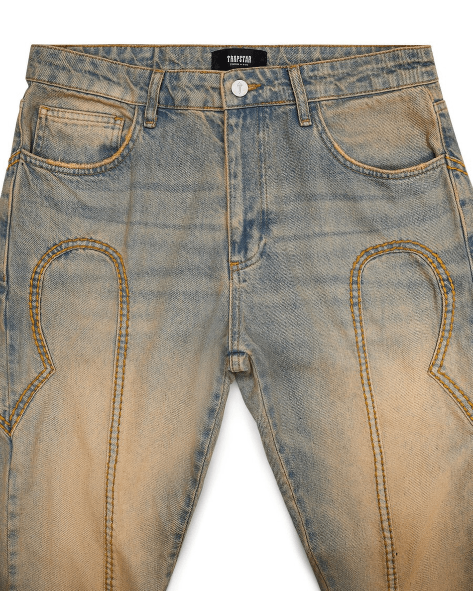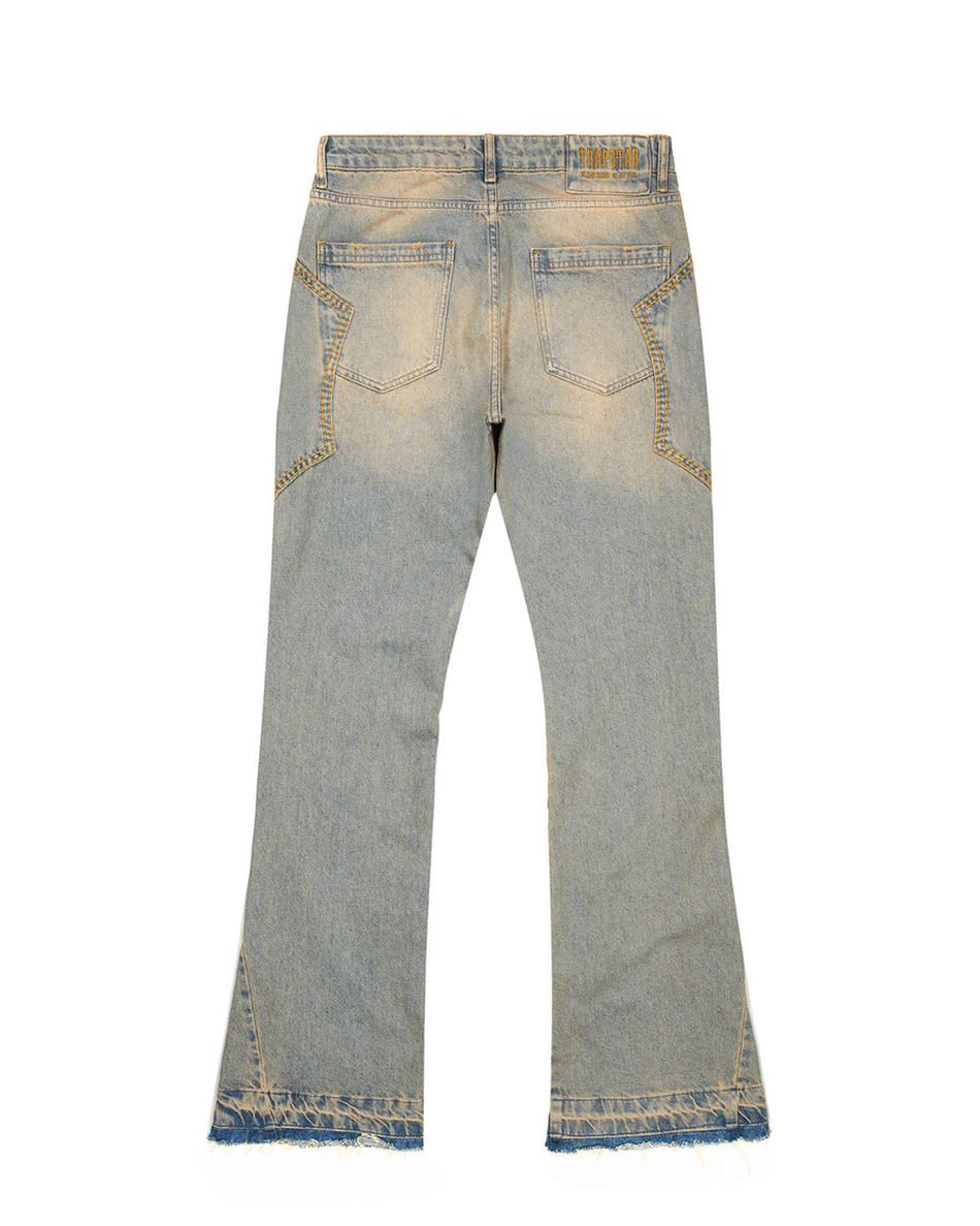 The Trapstar London Irongate Panel Denim Jeans - Sandy Blue are perfect for any occasion, whether you're heading out with friends or enjoying a relaxed day at home. The flared fit not only provides comfort but also adds a trendy flair to your look. The unique gusset panel detail and heavy top stitching showcase exceptional craftsmanship, making these jeans a must-have.