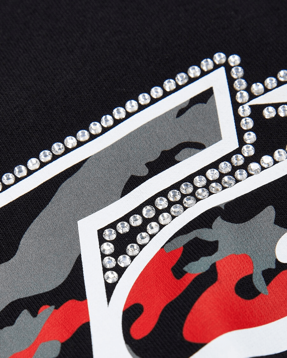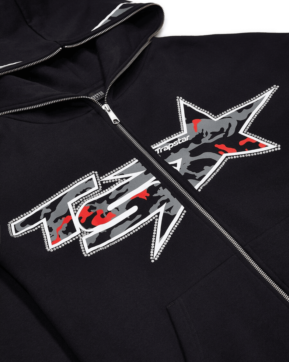 The Trapstar London TS Star Camo Hoodie - Black is designed for those who want to stand out while staying comfortable. The full-length zipper allows for versatile styling, whether you wear it zipped up or open over a t-shirt. With its unique TS star logo and shimmering diamanté detail, this hoodie makes a fashionable statement.