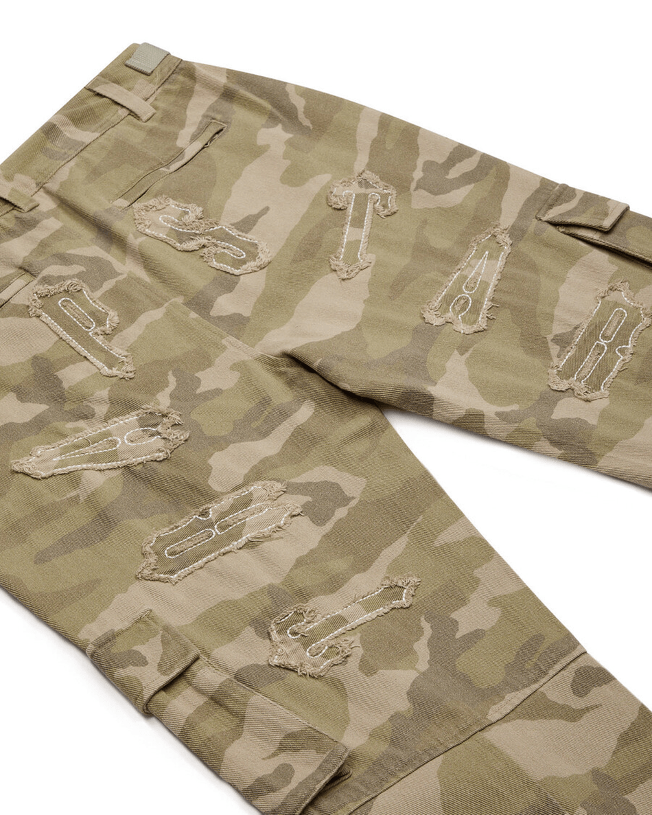 Discover the Trapstar London Women's Arch Applique Distressed Denim Cargo Pants - Desert Camo