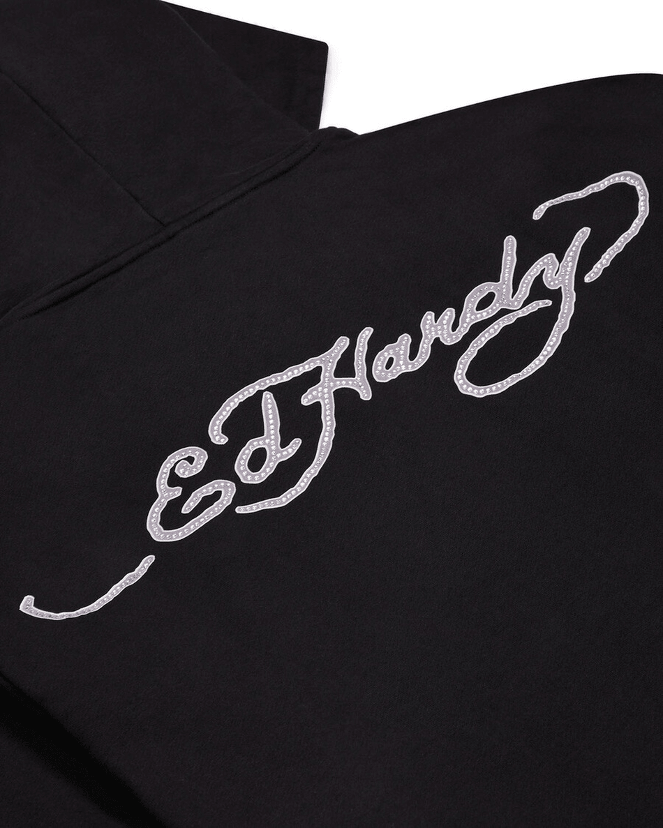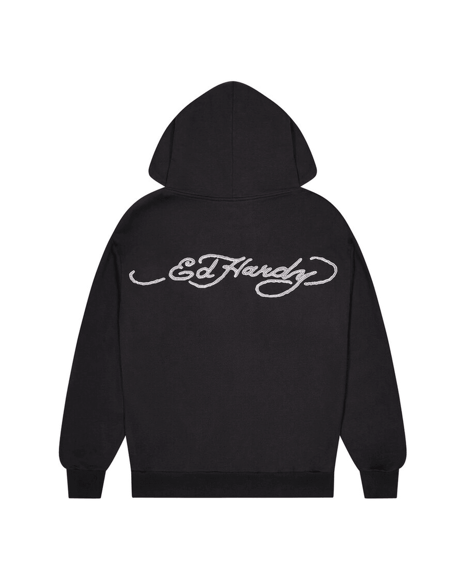 The Trapstar London x Ed Hardy Irongate Zip Through Hoodie - Black is designed for those who appreciate both style and substance. With its eye-catching Ed Hardy branding and diamante details on the back, this hoodie makes a statement wherever you go. The zip-through design allows for easy layering, making it ideal for both casual outings and more active days.